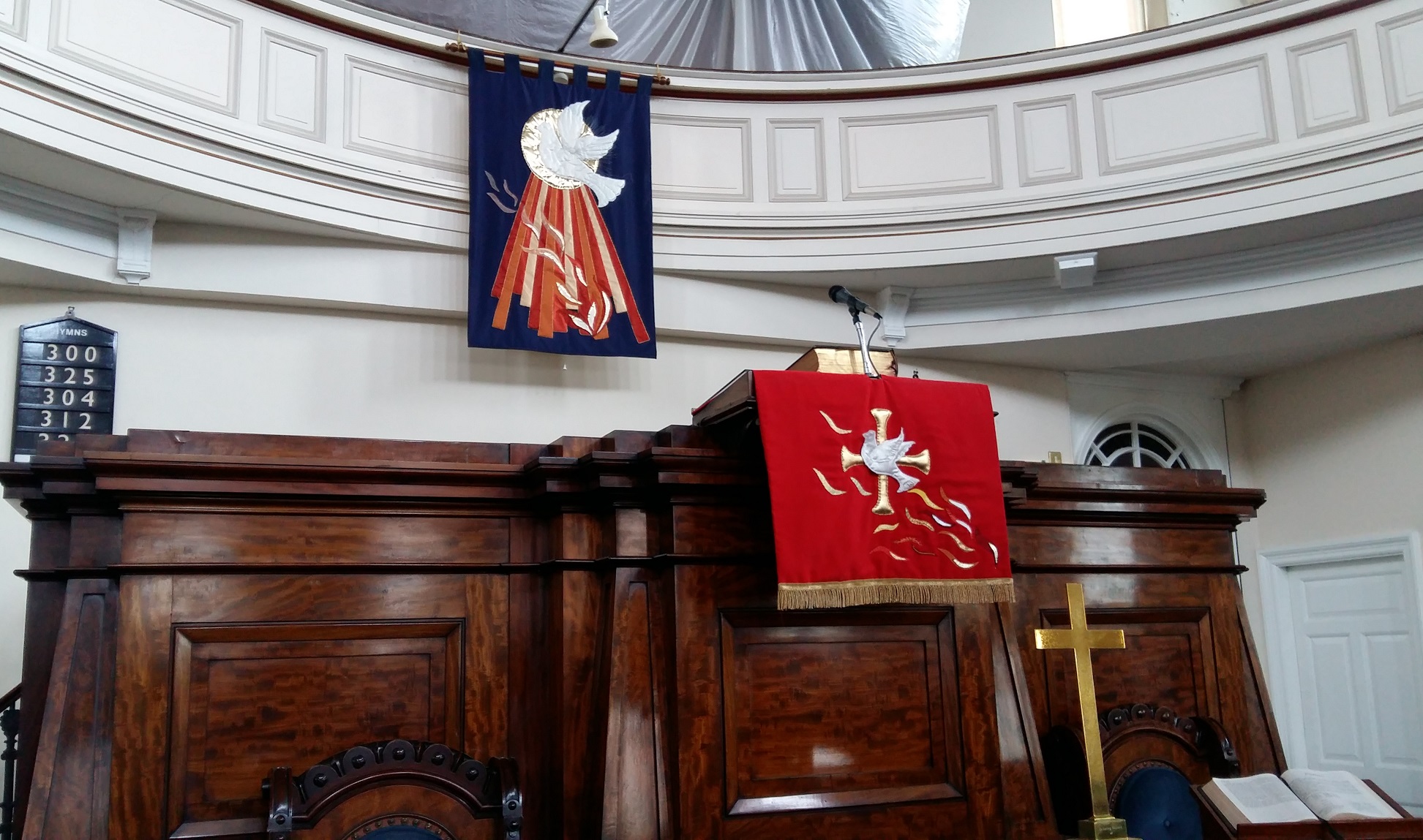 For the season of Pentecost, we’ve changed the hanging banner and pulpit fall in the chapel.